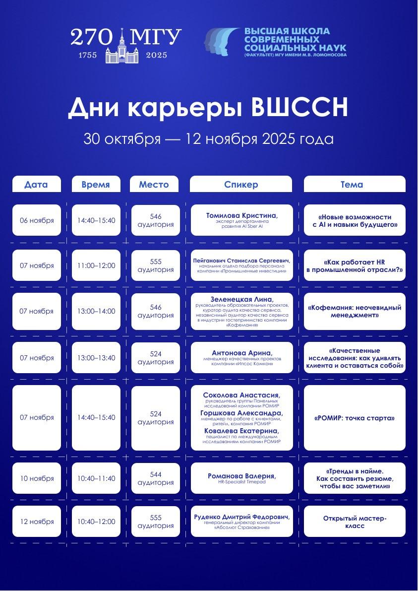 Факультет ВШССН МГУ имени М.В. Ломоносова приглашает студентов на Дни карьеры. Лекции и мастер-классы будут идти до 12 ноября.