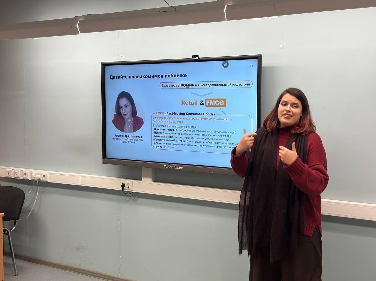 — Соколова Анастасия, Горшкова Александра, Ковалева Екатерина и Салихов Дмитрий, специалисты исследовательской компании «РОМИР», рассказали о возможностях для исследований в компании и разобрали применение теоретических знаний в реальном бизнесе.